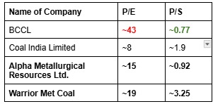 Post-IPO, BCCL is expected to trade at a P/E multiple of approximately 43.23, with a PEG ratio of around 1.19. In comparison, Coal India Limited trades at a significantly lower P/E of around 8.43. From a price-to-sales perspective, BCCL’s P/S multiple is approximately 0.77, compared with Coal India’s ~1.9. International peers trade at P/S multiples ranging from approximately 0.92 to 3.25 and P/E multiples in the range of 15 to 19.