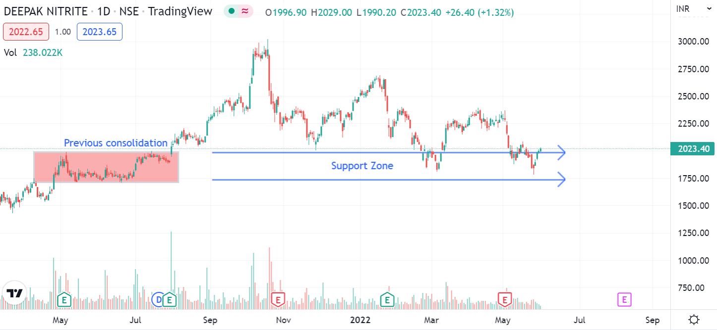 Observation: The stock was in a ferocious uptrend, but then had started correction and has now fallen about 40% from the top. The stock had consolidated for about 3 months in the range where it currently is and then had a run up, and has come to that zone again and now has bounced back from there, implying demand coming up at lower levels. We can also see a double bottom formation here.