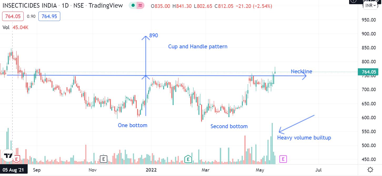 Observation: The stock is more or less in a sideways range and has formed a Cup and a Handle pattern. A double bottom pattern can also be seen here. The stock is currently trading near the neckline (resistance line) of the cup and handle pattern and is trying to break out from here. The volumes are very good, indicating strength in buyers.