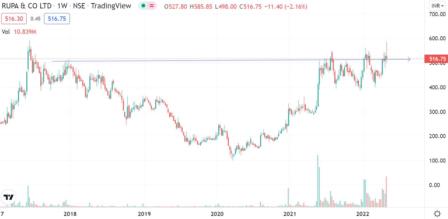 Observation: The stock has formed a rounding bottom on a weekly time frame. This is a bullish pattern. Once the neckline is broken, the stock travels the distance which is equal to size of the distance between the bottom and the neckline.