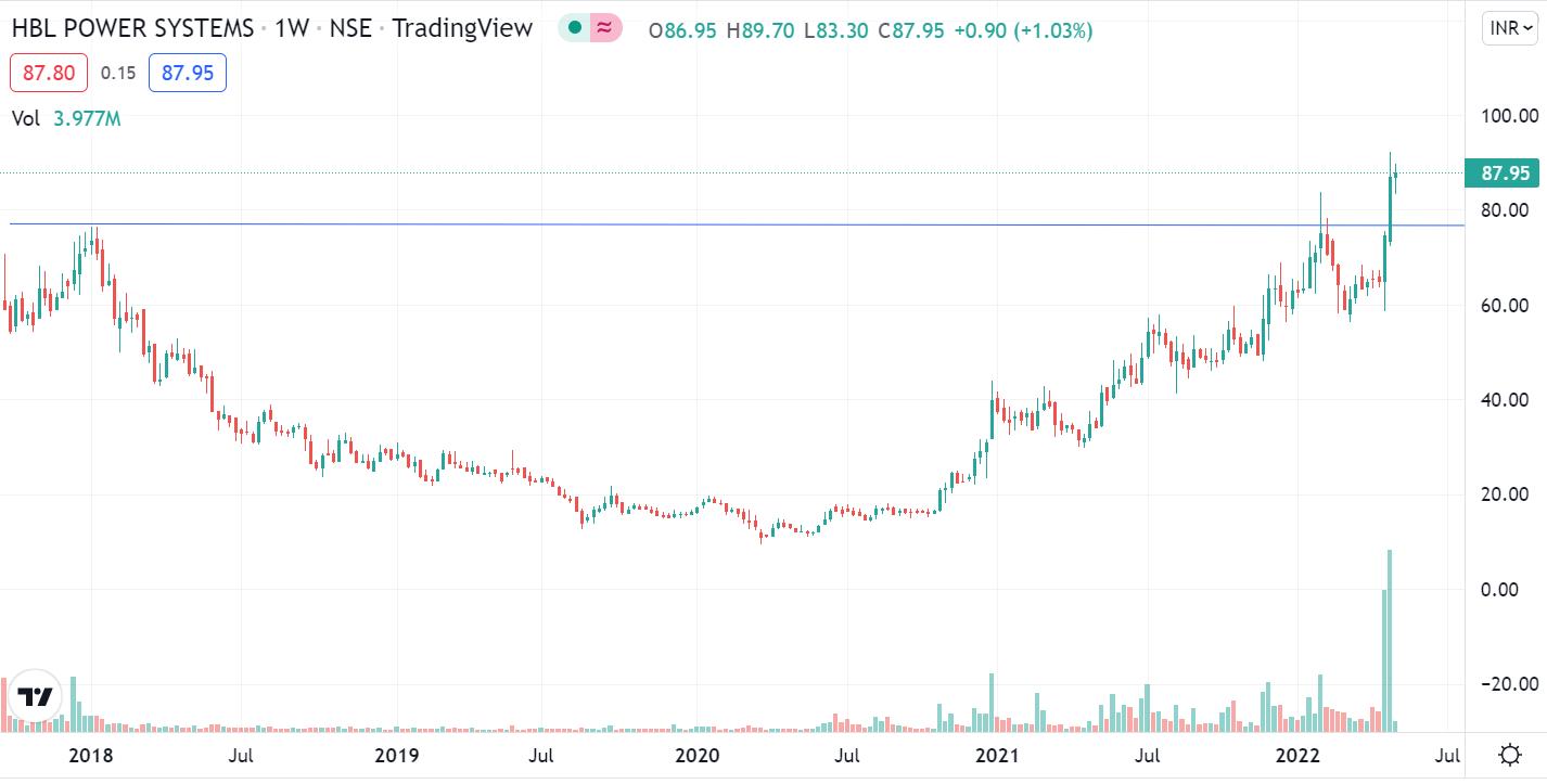 Observation: The stock has broken out of a Rounding bottom pattern on overwhelming volumes. The pattern took approx. 4.5 years to form and hence can be said to be a reliable one.