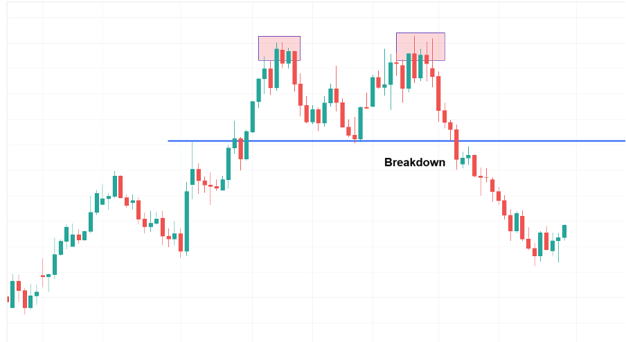 Second Peak: After the pullback, buyers attempt to push prices higher again, but the rally stalls near the level of the first peak, creating a second top. This second failure to break above resistance shows diminishing bullish strength.